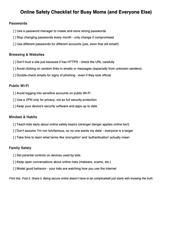 If you’re anything like me, a mom juggling school drop-offs, packed lunches, life, and the occasional TikTok scroll, you probably think you’ve got a decent handle on online safety. I mean, I don’t click sketchy links. I change my passwords regularly (which I thought I was supposed to), and if a site has that little padlock and says HTTPS, I feel pretty good about shopping there.