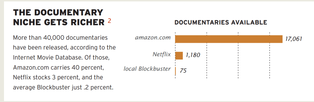 In his book, The Long Tail, author Chris Anderson explains how the internet has transformed our economy and our culture by shifting power away from the “hits” and toward the niches. In the past, success meant mass appeal. Stores only stocked bestsellers, radio stations played top 40 hits, and TV networks stuck to what they knew would pull in high ratings. However, with the rise of digital platforms like Amazon, Etsy, YouTube, and Netflix, everything changed. Suddenly, shelf space was unlimited and distribution was global. People could find exactly what they were into, no matter how specific, weird, or wonderfully niche it was. This couldn’t be more true in what I, personally, consume on all of my streaming services. A lot of the documentaries or true crime series that I enjoy would not do well in a theater experience or release, but can be a huge hit on platforms like Netflix.